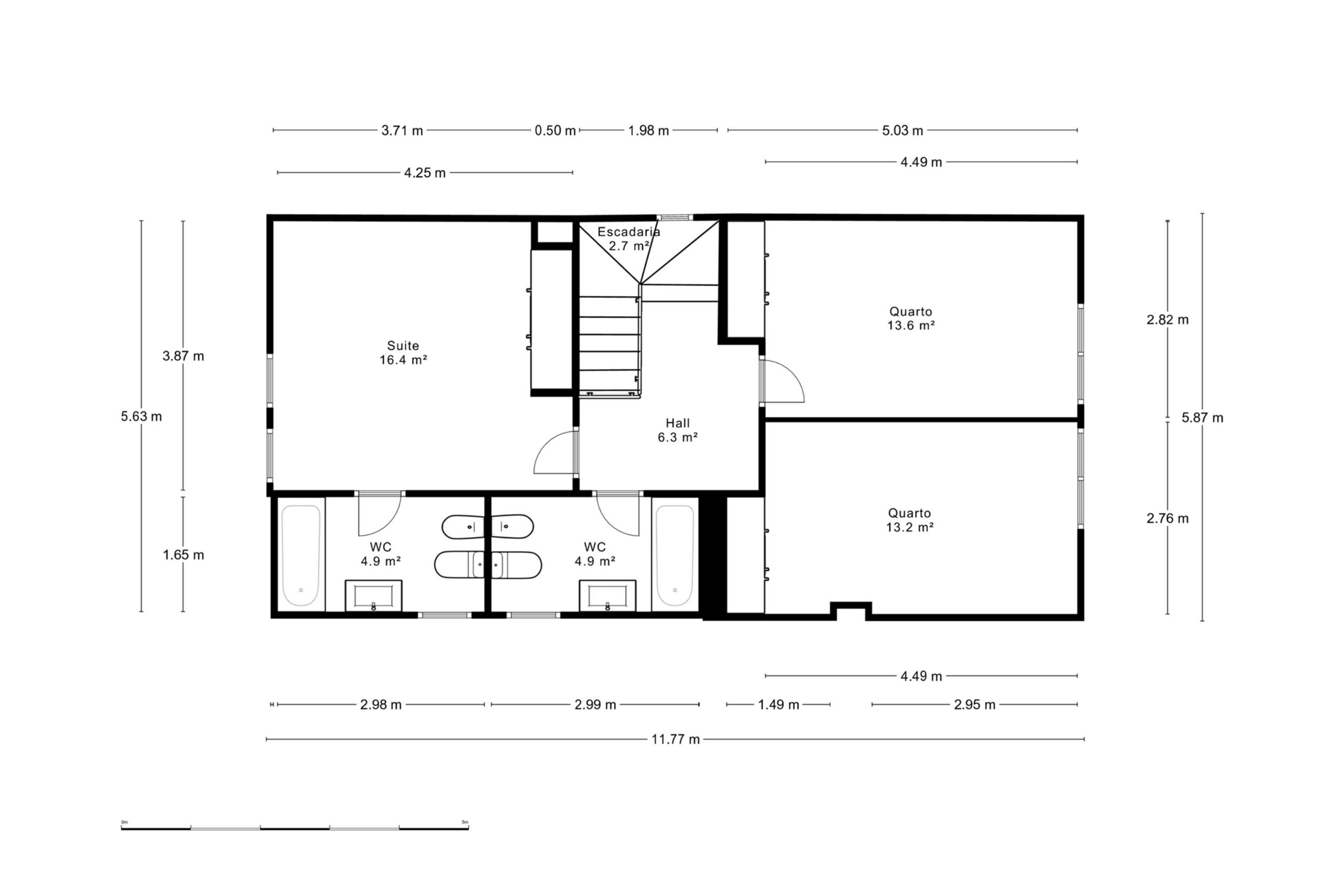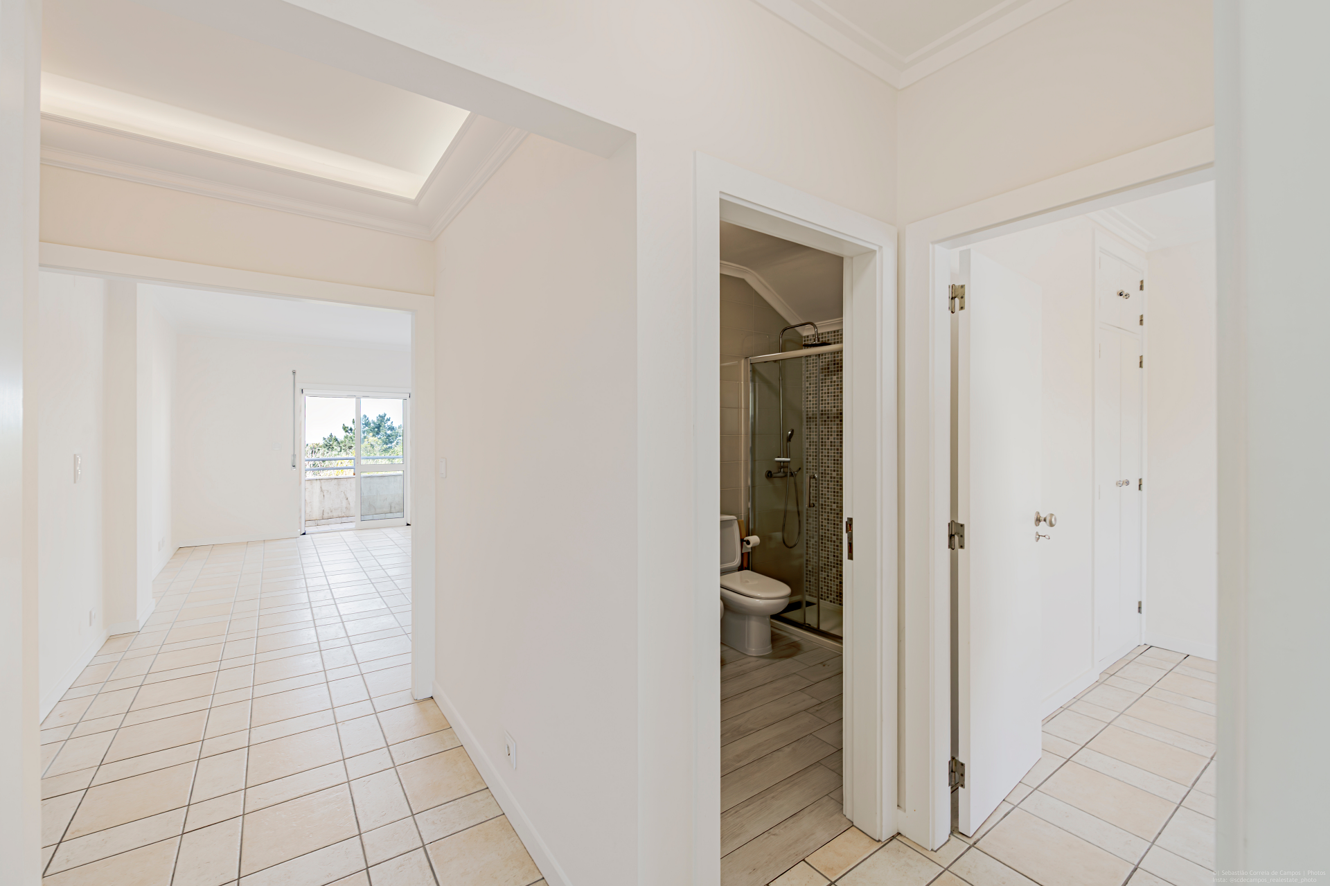 Neste piso superior encontra-se o hall de acesso aos quartos com 6,3m2, e os restantes 3 quartos com dimensões que vão desde os 16,4m2 da suite com a respetiva casa de banho completa com 5m2, e mais 2 quartos com 13,6m2 e 13,2m2, e ainda outra casa de banho completa com 5m2. Todos os 4 quartos dispõem de roupeiros embutidos.